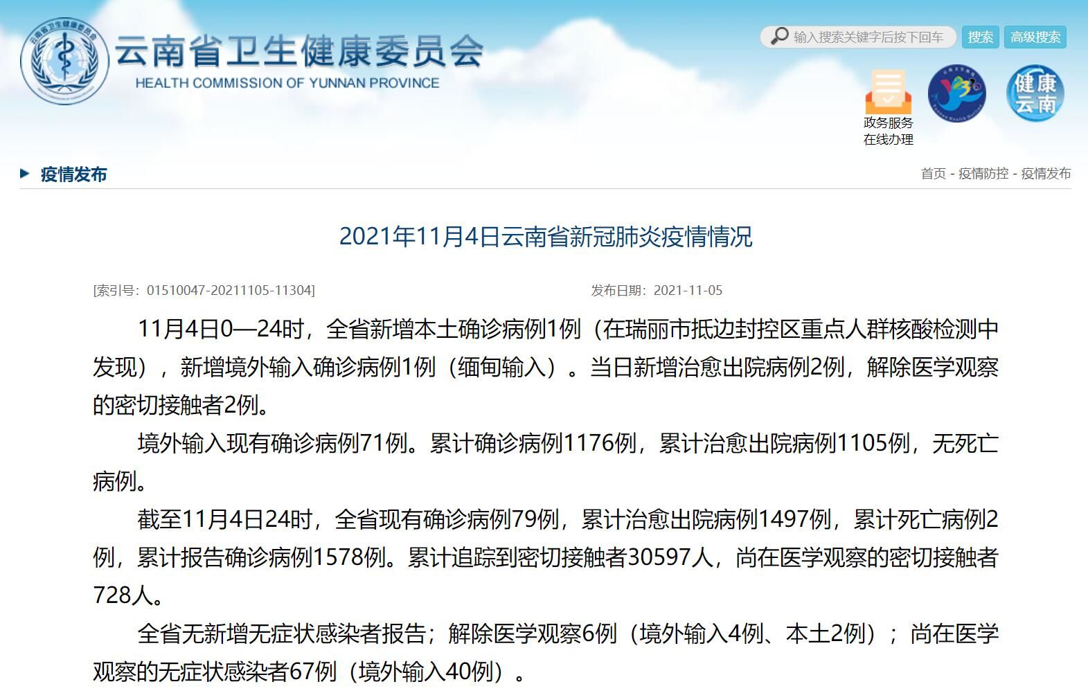 截至11月4日24时,全省现有确诊病例79例,累计治愈出院病例1497例,累计死亡病例2例,累计报告确诊病例1578例。累计追踪到密切接触者30597人,尚在医学观察的密切接触者728人。