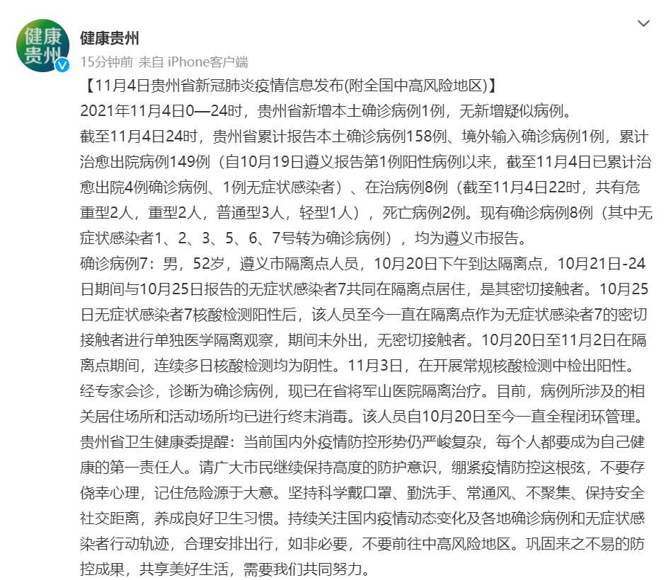 截至11月4日24时,贵州省累计报告本土确诊病例158例、境外输入确诊病例1例,累计治愈出院病例149例(自10月19日遵义报告第1例阳性病例以来,截至11月4日已累计治愈出院4例确诊病例、1例无症状感染者)、在治病例8例(截至11月4日22时,共有危重型2人,重型2人,普通型3人,轻型1人),死亡病例2例。现有确诊病例8例(其中无症状感染者1、2、3、5、6、7号转为确诊病例),均为遵义市报告。