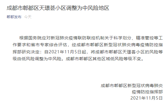 根据国务院应对新冠肺炎疫情联防联控机制关于科学划分、精准管控等工作要求和省市专家综合评估,经成都市郫都区新型冠状肺炎病毒疫情防控指挥部研究决定:自2021年11月5日起,将成都市郫都区天璟荟小区的风险等级由低风险调整为中风险。成都市郫都区其他区域低风险等级不变。