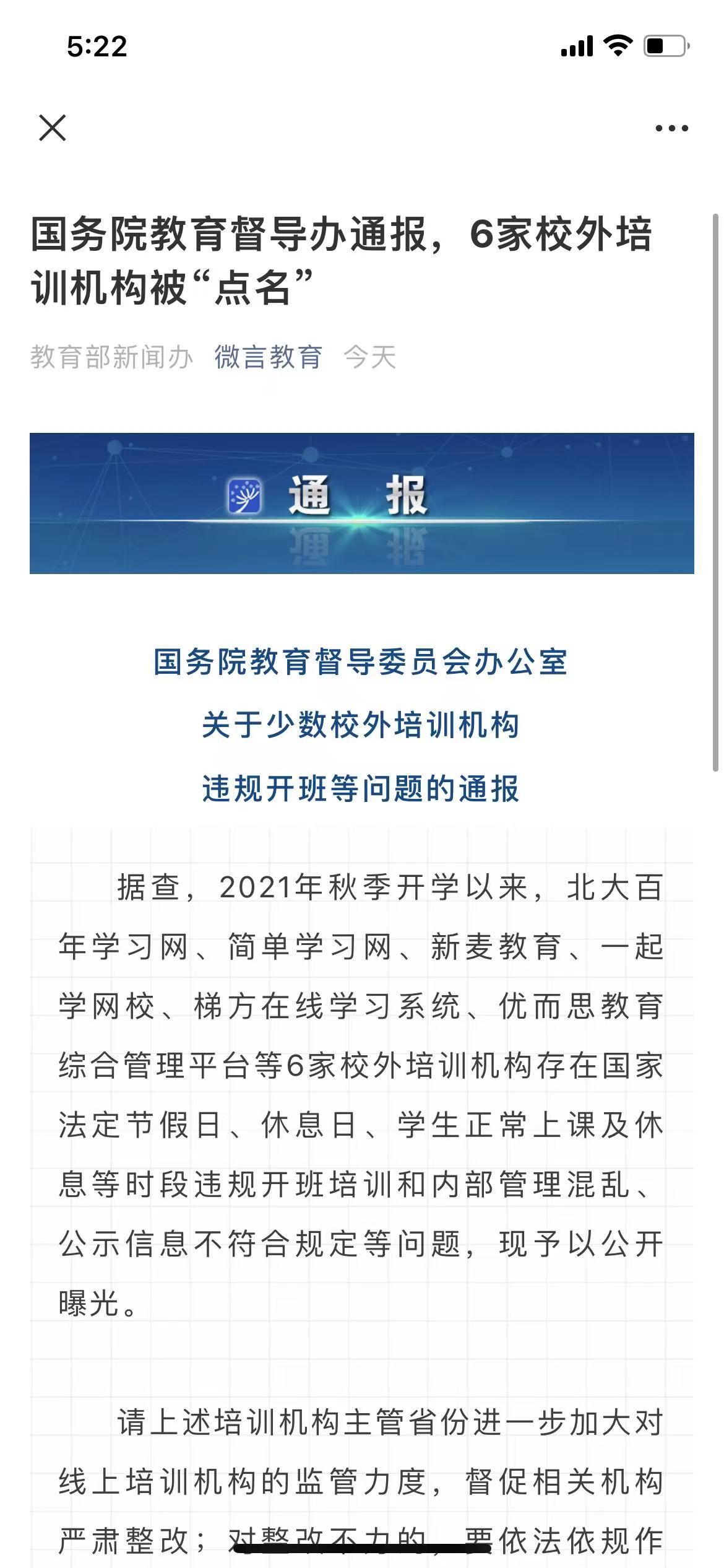 荔枝新闻讯 据“微言教育”微信公众号消息,国务院教育督导委员会办公室发布了关于少数校外培训机构违规开班等问题的通报。全文如下: