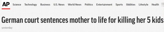 美联社援引德新社消息称,德国西部城市索林根一名母亲当地时间4日被判处终身监禁,原因是她被认定在家杀害了自己的5个子女。当地检察官认为,这名母亲杀害子女的诱因可能是前伴侣跟新女友的合影。