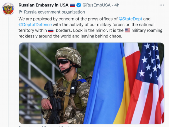 俄罗斯大使馆当天发推文说:“(美国)国务院和国防部新闻处对我们军事力量在俄罗斯境内国家领土上的活动感到担忧,我们对此困惑不解。照照镜子吧。美军肆无忌惮地在全世界游荡并留下一片混乱。”