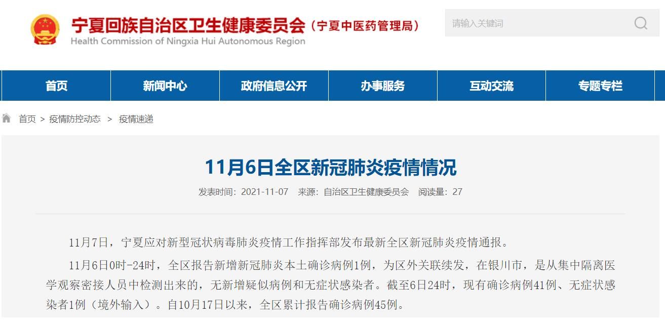 11月6日0时-24时,全区报告新增新冠肺炎本土确诊病例1例,为区外关联续发,在银川市,是从集中隔离医学观察密接人员中检测出来的,无新增疑似病例和无症状感染者。截至6日24时,现有确诊病例41例、无症状感染者1例(境外输入)。自10月17日以来,全区累计报告确诊病例45例。