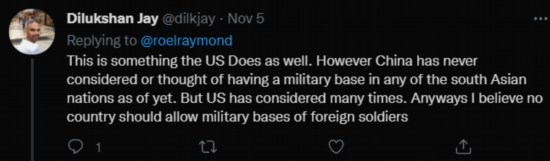 有网友称:“这是美国在做的事情。到现在为止,中国从未考虑或想过在任何一个南亚国家建立军事基地。但美国想过很多次了吧。反正我认为没有一个国家应该允许外国士兵军事基地(在本国的存在)。”↓