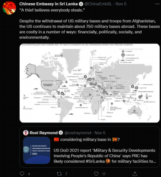 这条推文中,驻斯里兰卡大使馆开篇就表示:“‘小偷看谁都是小偷’。”随后,提及反而是美国拥有数量众多的海外军事基地,大使馆表示:“尽管美国的军事基地和军队已从阿富汗撤出,美国仍在海外维持着约750个军事基地。这些基地在很多方面花销巨大:经济上、政治上、社会和环境上。”↓