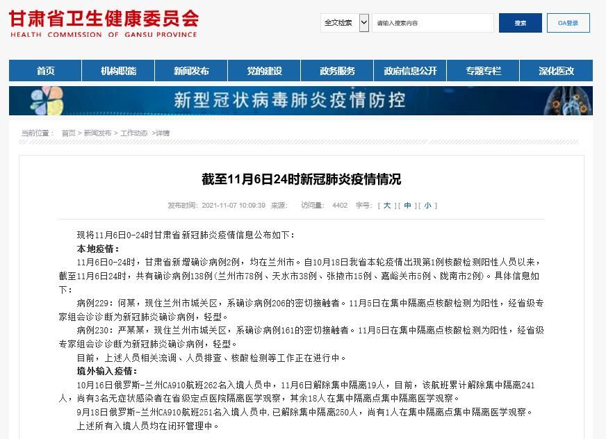 荔枝新闻讯 据甘肃省卫健委网站消息,11月6日0-24时甘肃省新冠肺炎疫情信息公布如下: