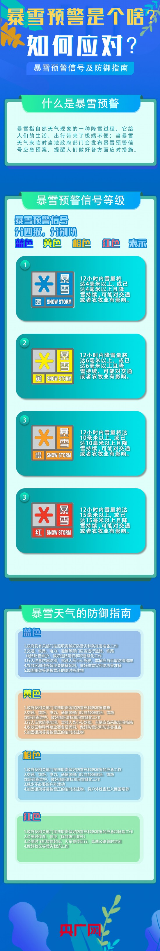 暴雪指自然天气现象的一种降雪过程,因为长时间大量降雪造成大范围积雪的一种自然现象,它给人们的生活、出行带来了极端不变。那么,暴雪预警信号分几级?蓝色、黄色、橙色、红色代表什么?如何预防?请看下图!