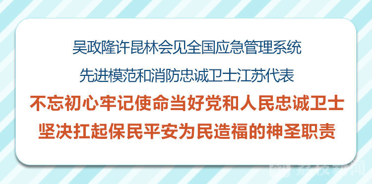 荔枝新闻讯 11月6日下午,省委书记吴政隆,省委副书记、代省长许昆林在南京会见了全国应急管理系统先进模范和消防忠诚卫士江苏代表。吴政隆强调,要坚持以习近平新时代中国特色社会主义思想为指导,牢记习近平总书记重要训词精神,认真落实党中央、国务院决策部署和省委、省政府工作要求,坚持人民至上、生命至上,不忘初心、牢记使命,坚决扛起保民平安、为民造福的神圣职责,全力守护好人民生命财产安全和社会大局稳定,当好党和人民忠诚卫士,为履行“争当表率、争做示范、走在前列”光荣使命,谱写“强富美高”新江苏建设现代化篇章作出新的更大贡献。