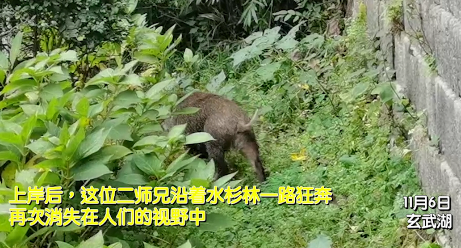 “游完泳跑到了玄武湖到模范马路间的水杉林,我们立刻报警,并且执法队员到现场进行驱逐,野猪动作矫健,它沿着城墙一路跑到了解放门,最后消失掉了。”南京玄武湖管理处办公室主任戎飞霞说。