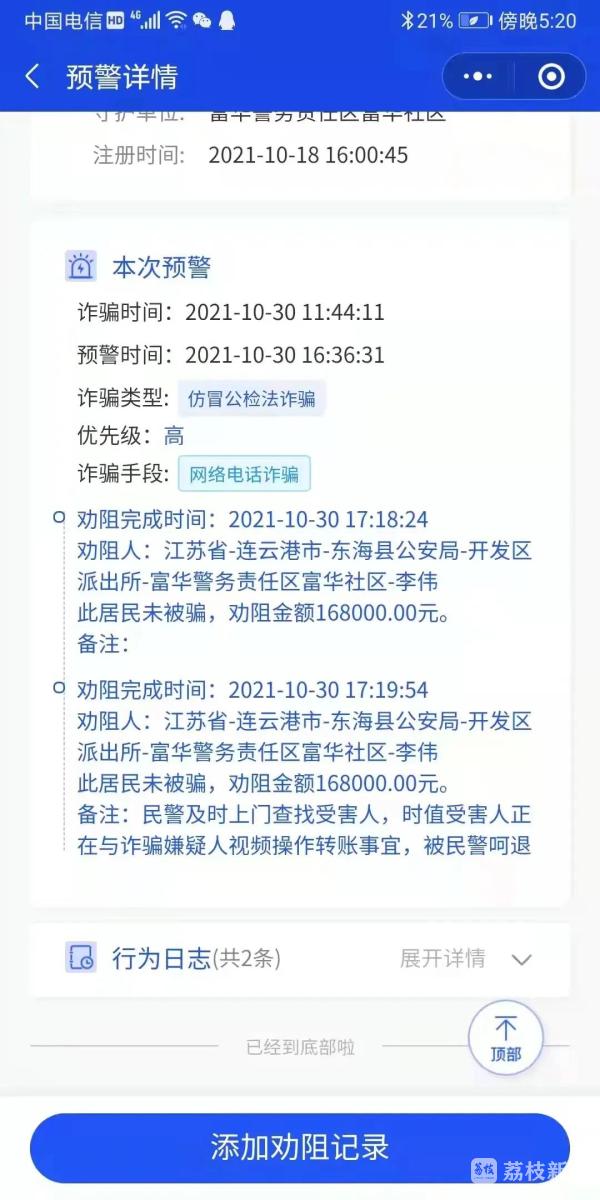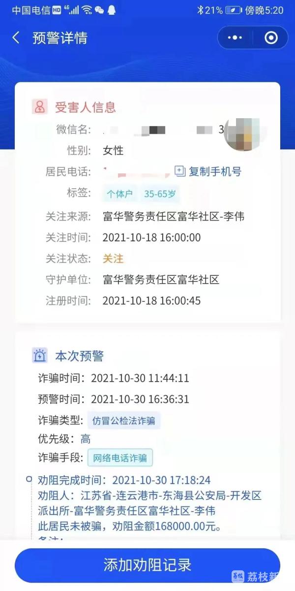 事发当天下午,东海县公安局开发区派出所民警李伟通过反诈“金钟罩”系统接收到预警信息:辖区居民李某正在遭受仿冒公检法诈骗。