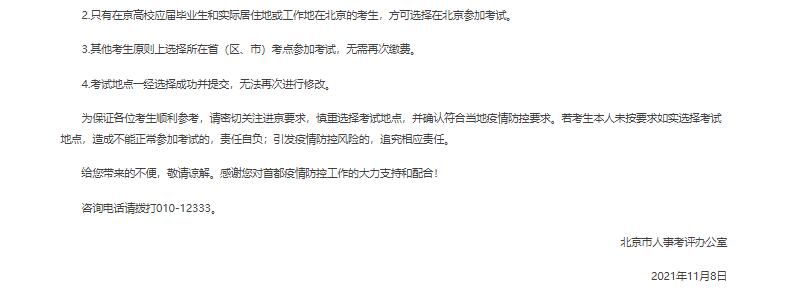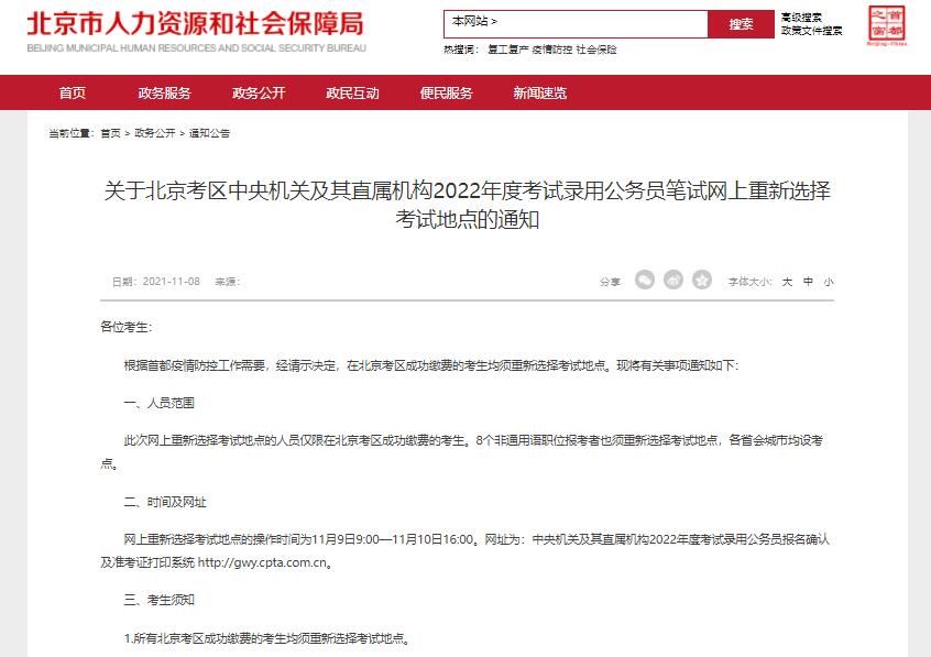 荔枝新闻讯 北京市人力资源和社会保障局网站11月8日发布“关于北京考区中央机关及其直属机构2022年度考试录用公务员笔试网上重新选择考试地点的通知”,全文如下: