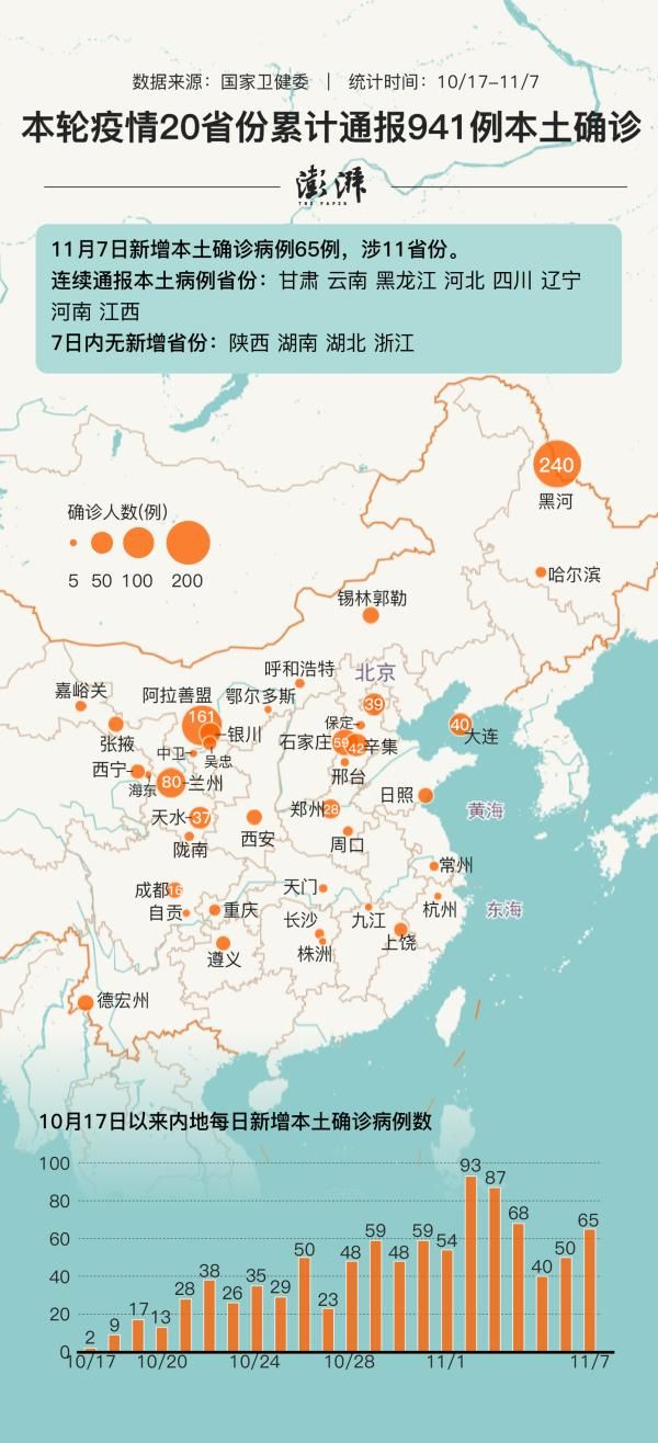 11月7日0—24时,中国内地新增本土确诊病例65例,涉及11省份。至此, 10月17日以来已累计本土确诊病例941例。本轮疫情波及20个省份,本土确诊病例最多的为黑龙江(245例),其次为内蒙古(183例)、甘肃(140例)。最近几日,前述3省份防控效果正在逐步显现,每日新增确诊病例均降至个位数。
