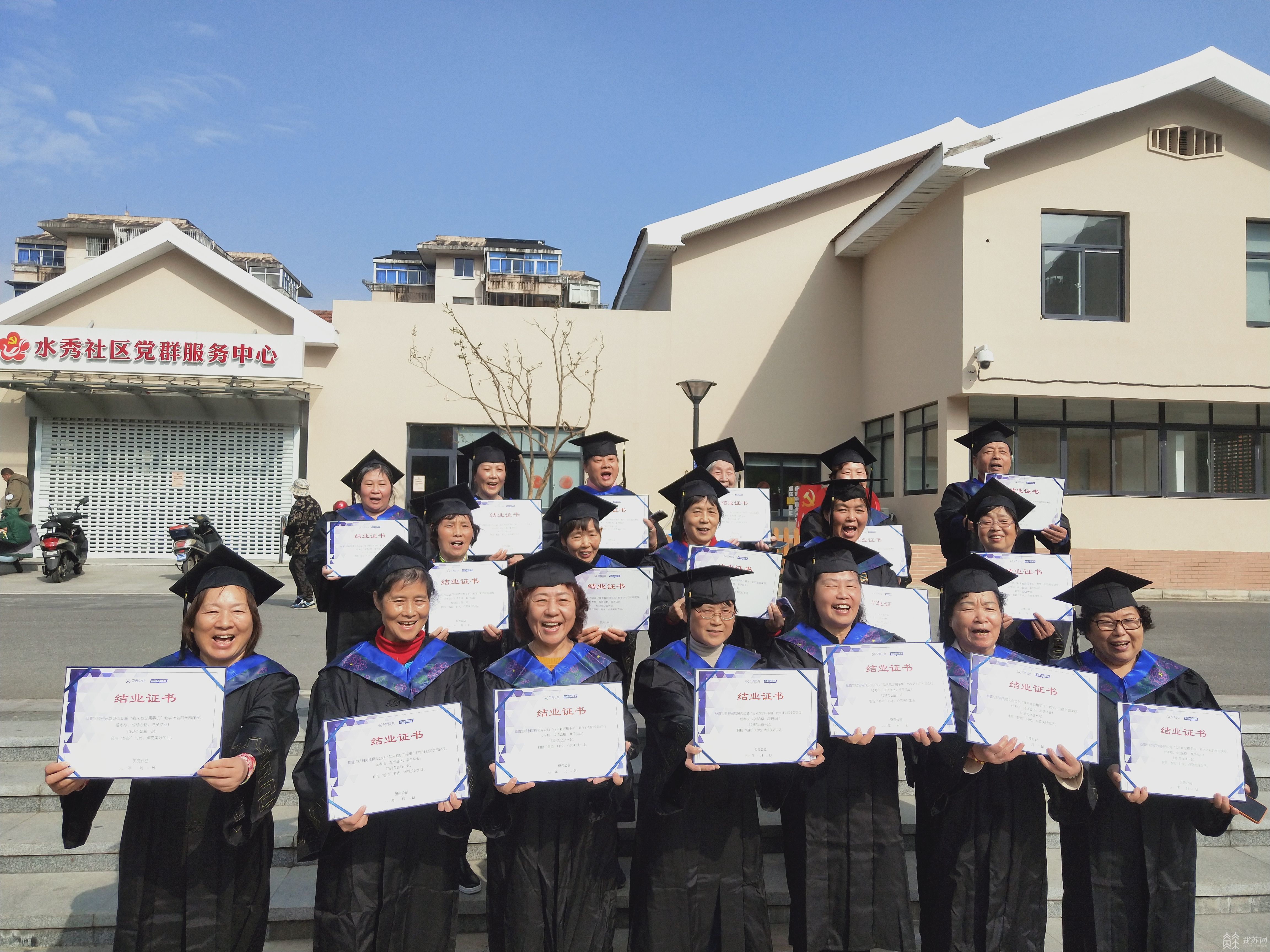 从2021年4月起,开展了一系列手机培训课程,从注册苏康码到灵活使用微信,跨越半年时间,首批20位老人戴着博士帽顺利结业。
