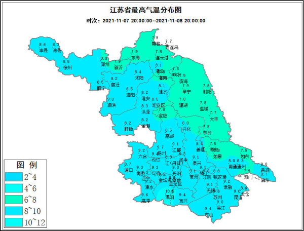 气象部门表示,本周江苏气温是一个回升状态,但是受新一股弱冷空气影响,回升速度会比较慢。“11号有一个冷空气补充,12号早晨,全省的最低气温淮北地区是0℃左右,其他地区大概在2~3℃,9号的全省最高气温是在12℃左右,到周末的时候最高气温能达到17~18℃,气温总的来说是一个回升的,但是回升的并不快。”蒋义芳告诉记者。