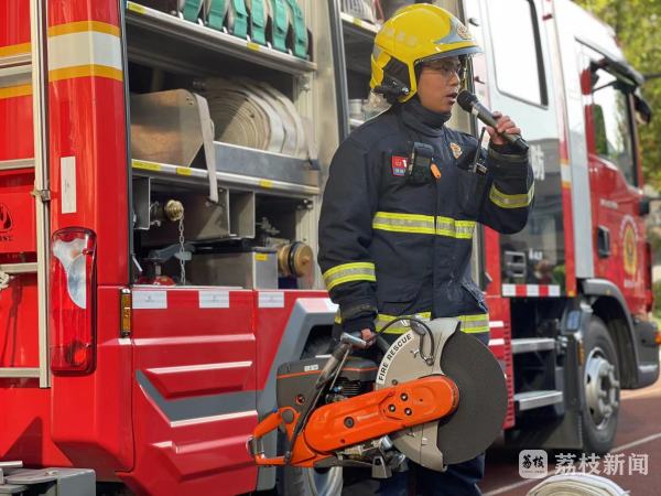 现场除了消防演习,还有学生们特别喜欢的消防器材讲解,来自南京市消防救援支队玄武区大队富贵山消防救援站副站长邵靖峰向大家介绍消防专业器材,包括消防水带、金属切割机、电动扩张钳等。“学校发生火灾,同学们要在老师的引导下有序疏散,在疏散时不能推挤。如果说烟气没有危及到我们正常走路,可以不用弯腰捂鼻,如果烟气比较浓,不能正常行动,可以将毛巾捂住口鼻,弯腰疏散。在我们疏散的过程中,严防踩踏事故的发生。”邵靖峰说。