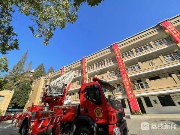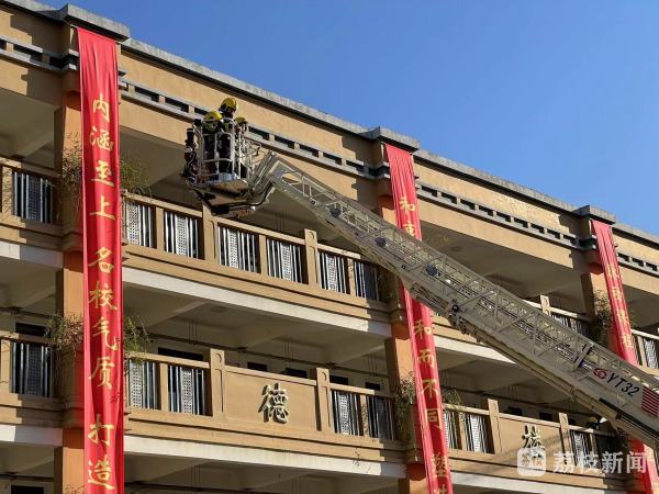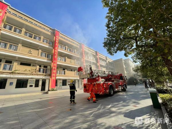 就在消防车驶入校园时,教学楼三楼教师办公室外挂机着火,四楼被困学生和老师正在大声呼救。玄武区消防救援大队的消防员用手台广播分工合作,一边进行灭火,一边进行被困师生的救援。只见消防员身手敏捷,手提消防水管,迅速对接好水枪口,快速来到失火地点进行灭火;楼下的消防员利用消防车上的高压水枪对失火地点进行喷洒,在消防员的努力下明火很快扑灭。在扑灭火情的同时,另一辆消防也展开云梯,一名消防员站在云梯上。在消防员的帮助下,被困师生登上云梯工作斗,戴好消防头盔,绑好安全带,云梯绕过学校主题台,把师生安全送到操场。