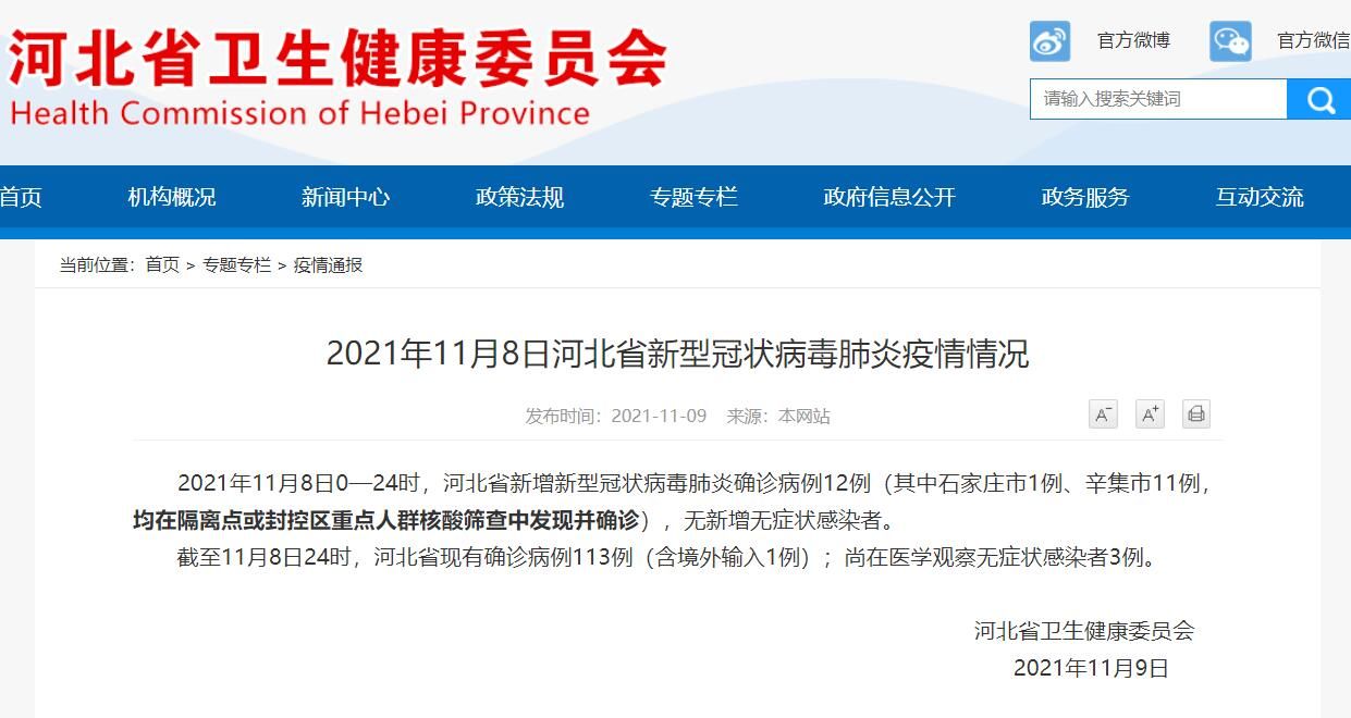 荔枝新闻讯 据河北省卫健委消息,2021年11月8日0—24时,河北省新增新型冠状病毒肺炎确诊病例12例(其中石家庄市1例、辛集市11例,均在隔离点或封控区重点人群核酸筛查中发现并确诊),无新增无症状感染者。