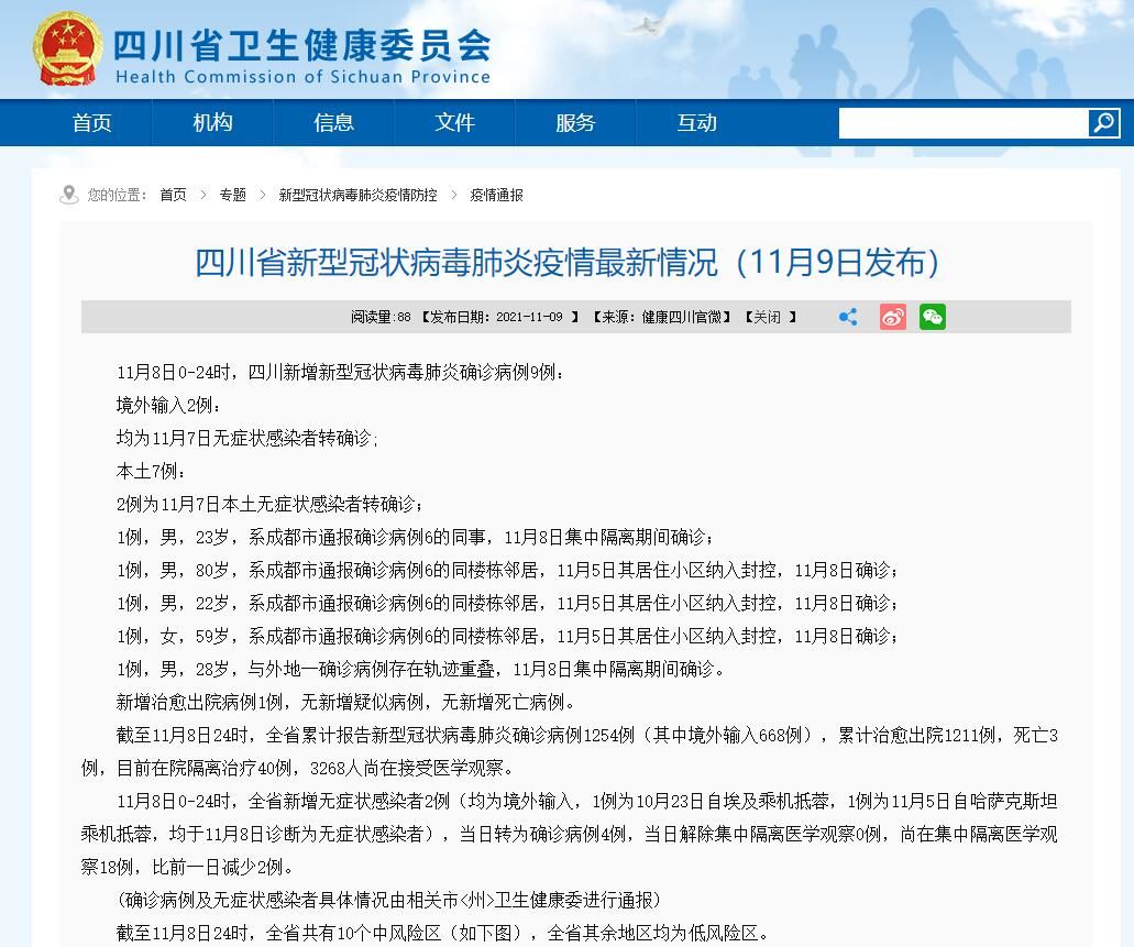 荔枝新闻讯 据四川省卫健委消息,11月8日0-24时,四川新增新型冠状病毒肺炎确诊病例9例: