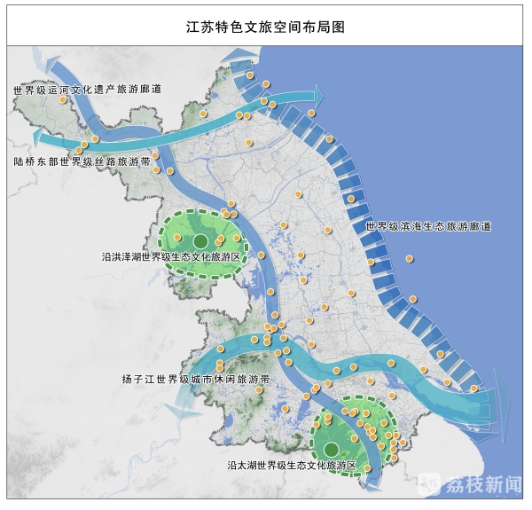 记者注意到,为提升文旅发展内涵能级,《规划》把空间布局摆在了突出显著的位置。首次提出构建“两廊两带两区”文旅空间体系,即培育打造世界级运河文化遗产旅游廊道、世界级滨海生态旅游廊道、扬子江世界级城市休闲旅游带、陆桥东部世界级丝路旅游带、沿太湖世界级生态文化旅游区、沿洪泽湖世界级生态文化旅游区。