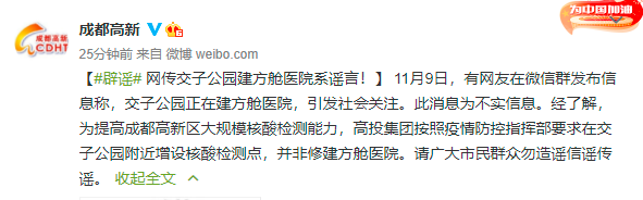 荔枝新闻讯 据@成都高新微博通报 11月9日,有网友在微信群发布信息称,交子公园正在建方舱医院,引发社会关注。此消息为不实信息。经了解,为提高成都高新区大规模核酸检测能力,高投集团按照疫情防控指挥部要求在交子公园附近增设核酸检测点,并非修建方舱医院。请广大市民群众勿造谣信谣传谣。