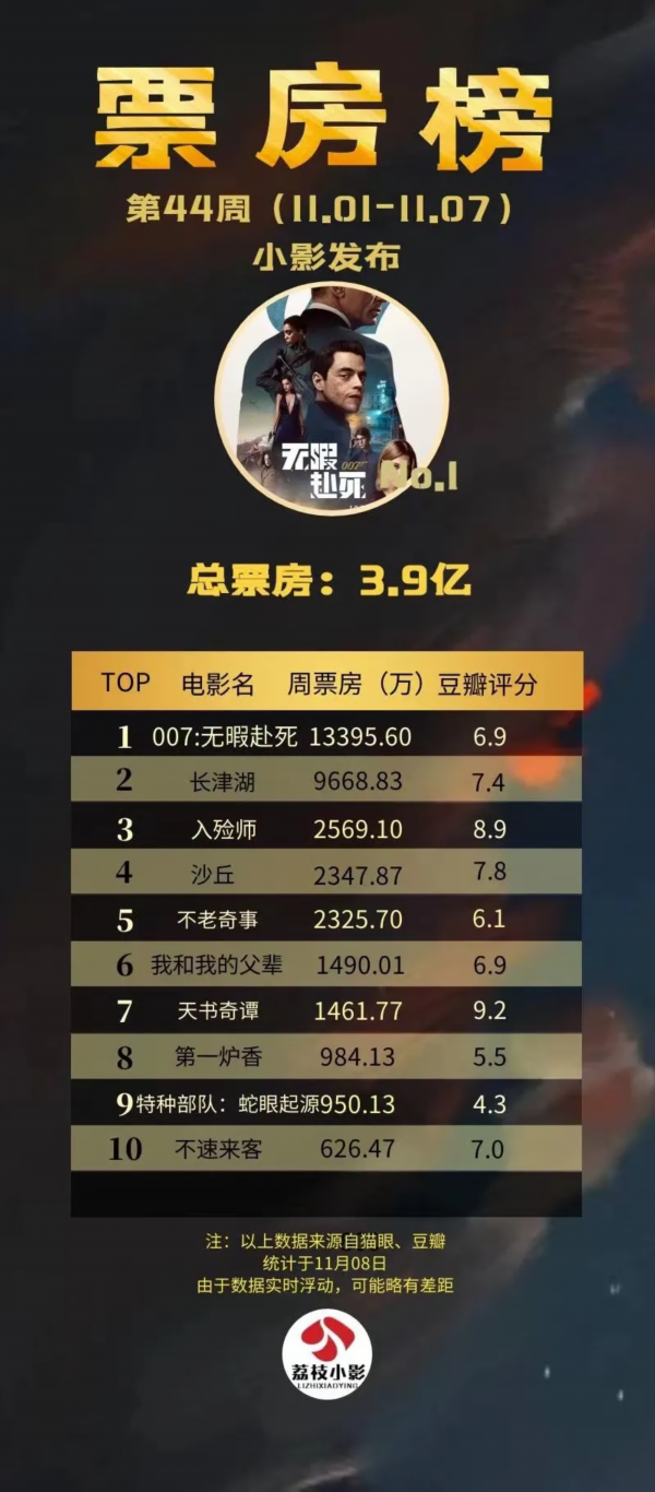 本周票房呈现分散化趋势,《007:无暇赴死》打破了《长津湖》连续周冠军的市场格局,周票房1.34亿,以较明显优势位居榜首;而另一部好莱坞大片《特种部队》由于宣发力度不足,票房未突破一千万。