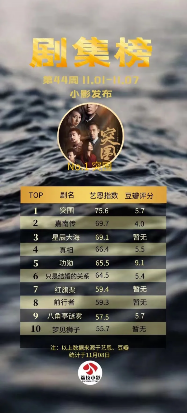 此外,《突围》《真相》《嘉南传》《前行者》发挥稳定;《只是结婚的关系》《红旗渠》两部剧收官,前者是主打年轻市场的总裁小甜剧,后者是斩获中老年市场的年代剧,两部剧热度持续上升中。
