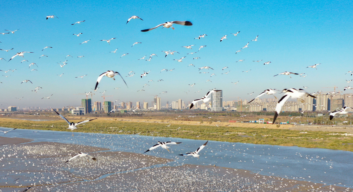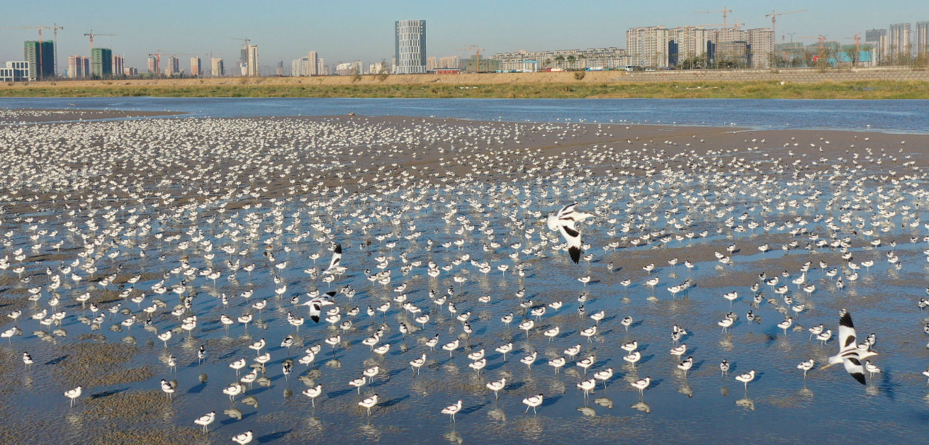 今天上午,记者看到反嘴鹬在赣榆海州湾沿海湿地飞翔。近期,位于连云港市赣榆区境内的海州湾湿地迎来大批反嘴鹬。它们或在水面驻足憩息觅食,或在空中振翅飞翔,把冬日的湿地装扮得生机勃勃。近年来,当地不断增大对沿海湿地的保护力度,生态环境得到有效修复。