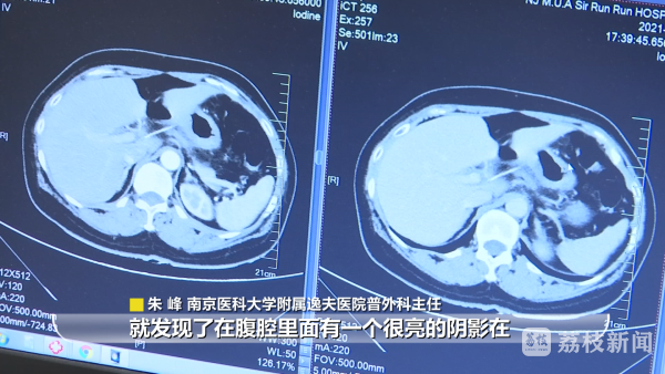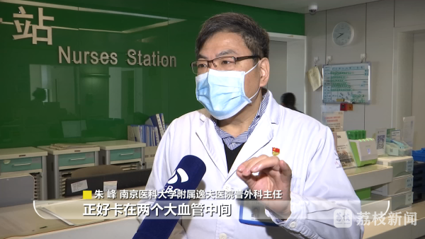 “给她做了一个CT检查,就发现了在腹腔里面有一个很亮的阴影在,正好卡在两个大血管中间,一个是肝动脉、一个是肝脏的门静脉,如果不及时手术就很凶险了。一种情况,扎到血管以下,它会引起大出血;第二个,她就是暂时不出血,它会在局部形成脓肿溃疡,就把这个血管给烂穿掉,导致后期大出血。”南京医科大学附属逸夫医院普外科主任朱峰告诉记者。