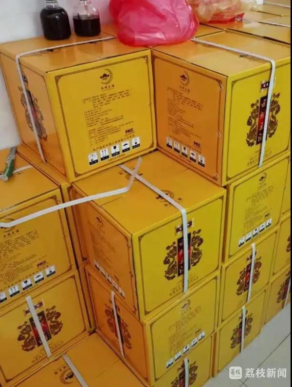 当事人现场店内角落放有上述视频中宣传的百果郎牌西域王酒44箱(每箱6瓶),从产品外包装说明来看,该酒为普通的配制酒,未见功能性用语标注。