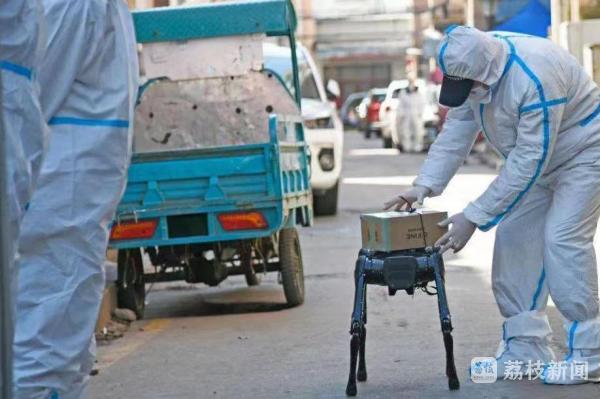 除了无人机,在天宁此次的疫情防控中,科技化手段正成为不可或缺的力量。11月8日上午,由常州本土公司改装的机器狗等智能设备,忙碌地穿梭在封控小区工人新村一社区区域内。机器狗充当着“快递员”,将物资转送到居民手中。此款机器狗可用于消防救援、勘探侦察等复杂环境,同时能执行远距离测温、负重载物等工作。