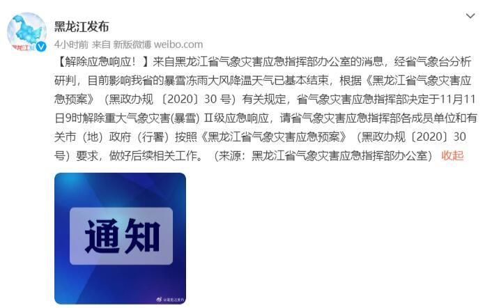 荔枝新闻讯 据“黑龙江发布”微博消息,经黑龙江省气象台分析研判,目前影响黑龙江省的暴雪冻雨大风降温天气已基本结束,根据《黑龙江省气象灾害应急预案》(黑政办规 〔2020〕30 号)有关规定,黑龙江省气象灾害应急指挥部决定于11月11日9时解除重大气象灾害(暴雪) Ⅱ级应急响应,请黑龙江省气象灾害应急指挥部各成员单位和有关市(地)政府(行署)按照《黑龙江省气象灾害应急预案》(黑政办规〔2020〕30 号)要求,做好后续相关工作。