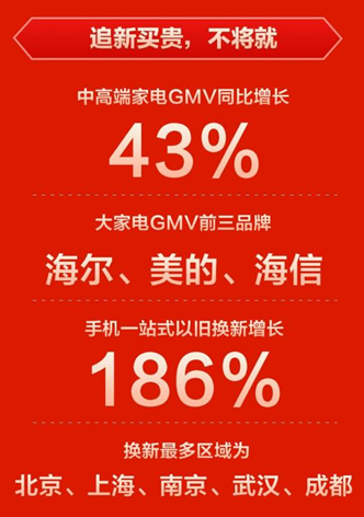 数据显示,11日前30分钟,苏宁易购中高端家电走俏,销售同比增长43%,海尔、美的、海信成为大家电销售Top3品牌。绿色循环理念下,3C品类呈现“消费升级,碳排降级”趋势,手机一站式以旧换新同比增长186%,其中换新最多的区域为北京、上海、南京、武汉、成都。