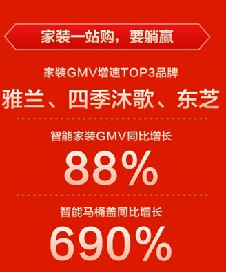 家电热销带动家装走俏,数据显示,双十一消费者偏爱家装家电一站购,家装销售增速TOP3品牌为雅兰、四季沐歌、东芝。全屋智能成“造家”新势力,智能家装销售同比增长88%,其中智能马桶盖同比增长690%。