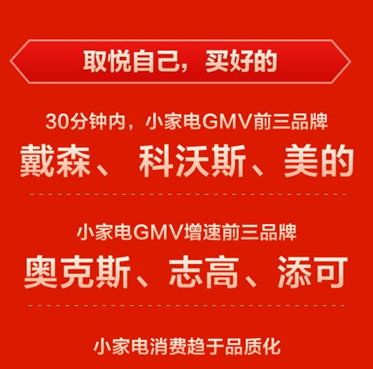 伴随悦己消费崛起,苏宁易购小家电消费呈现品质化趋势。30分钟内,戴森、科沃斯、美的成为“精致”用户最青睐的销售Top3小家电品牌,奥克斯、志高、添可位列增速最快品牌前三。