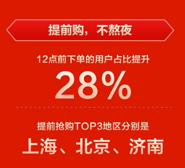 提前购,不熬夜,数据显示,今年双十一消费者乐于提前抢购付款,12点前下单的用户占比提升28%,上海、北京、济南登顶“手速最快”消费城市。