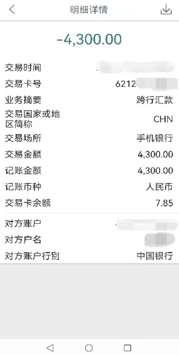 江女士毫不犹豫的照做后,感觉有些不对劲,于是立即打开银行APP进行查看,发现卡内的4300元余额被转到了一个私人帐号中。江女士寻问对方为什么会扣她的钱,对方则表示是为了验证此卡是否是她本人在使用,而且公司还要做流水。之后,对方一直打电话让江女士继续在其他贷款平台上操作,江女士发现不对劲,便没有继续操作,而是来到派出所报了警。
