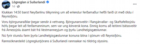 冰岛警方发布公告说,11月10日下午14:50左右,紧急热线接到电话称,一名中国女游客在黑沙滩被海浪卷入海中。搜救队抵达现场后,立即开始搜救。当天晚些时候,救援直升机在黑沙滩附近的海中发现了该女子的遗体。
