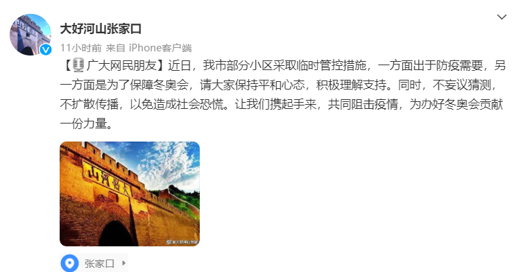 荔枝新闻讯 据“大好河山张家口”微博消息,近日,张家口市部分小区采取临时管控措施,一方面出于防疫需要,另一方面是为了保障冬奥会,请大家保持平和心态,积极理解支持。同时,不妄议猜测,不扩散传播,以免造成社会恐慌。让我们携起手来,共同阻击疫情,为办好冬奥会贡献一份力量。