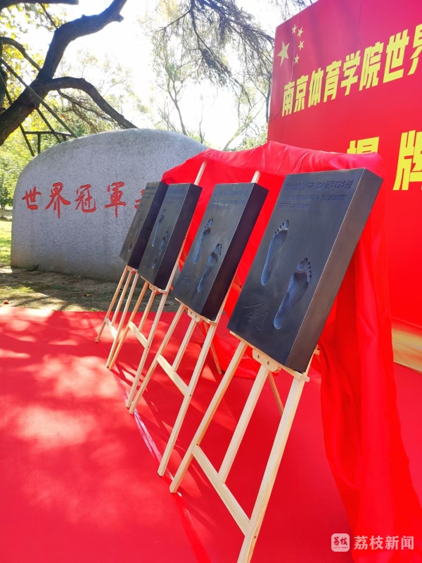 金松、张雨霏、崔登荣共同为新增世界冠军脚印揭牌。随着红色幕布徐徐揭开,刻有张雨霏、陆光祖、何冰娇、夏玉婷四位世界冠军夺冠时间、地点、脚印拓片和手写签名的铜板在众人面前展示开来。