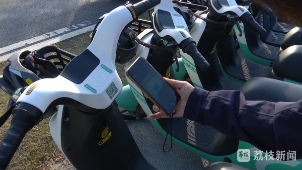 共享助力车企业溧水区负责人罗来星介绍:“每辆车设定一个最低的换电标准,比如讲石湫镇这边的车辆设置的换电标准电量40%。电量低于40%的话,我们会通过智能换电系统看到这辆车剩余多少电、在哪里,我们可以及时去换。”另一个品牌溧水运营中心运营经理严苏杰向记者介绍说:“我们会把所有路面上的跟交运部门数据同步的线下非机动车框,通过北斗的设备精确地把它采集下来,这个精度是0.1米。在这个基础上我们会结合车身定位的精度要求用户定点停车、秩序停放。”