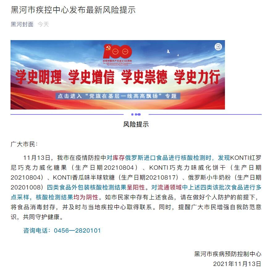 荔枝新闻讯 据“黑河封面”微信公众号消息,11月13日,黑河市在疫情防控中对库存俄罗斯进口食品进行核酸检测时,发现KONTI红罗尼巧克力威化糖果(生产日期20210804)、KONTI巧克力味威化饼干(生产日期20210804)、KONTI香瓜味半球软糖(生产日期20210817)、俄罗斯小牛奶粉(生产日期20201008)四类食品外包装核酸检测结果呈阳性。对流通领域中上述四类该批次食品进行多点采样,核酸检测结果均为阴性。如市民家中存有上述食品,请在做好个人防护的前提下,将食品消毒封存,并及时与当地疾控中心取得联系。同时,提醒广大市民增强自我防范意识,共同守护健康。