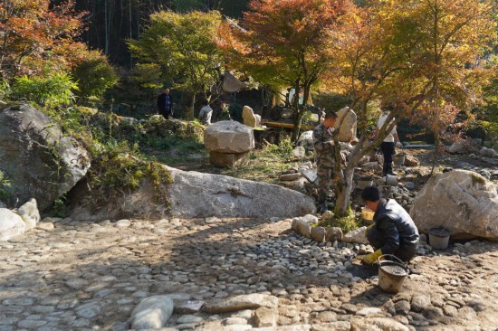 图为蓝山县湘江源瑶族乡坪源村,当地村民在铺设游步道。(胡盼盼摄)