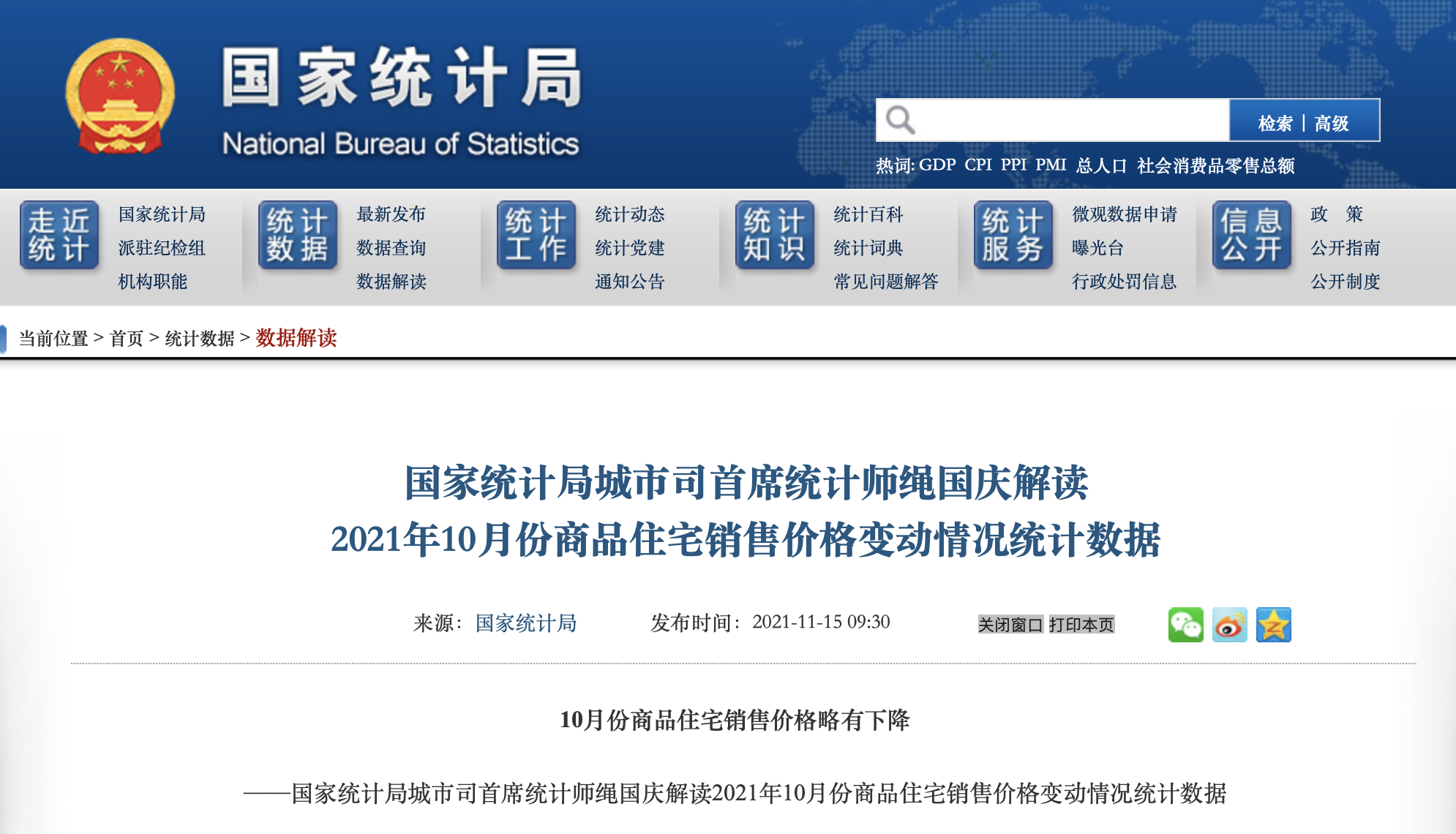 2021年10月份,70个大中城市商品住宅销售价格环比总体延续略降态势,同比涨幅继续回落。