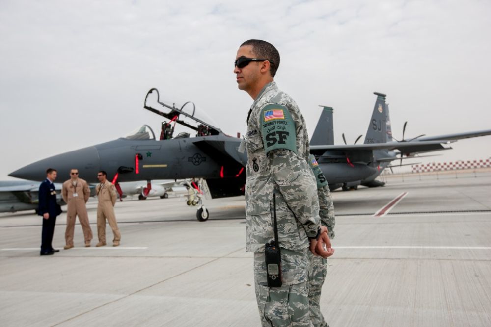 2013年11月17日,在阿联酋迪拜阿勒马克土姆国际机场,一名美军士兵在参展的F-15战斗机旁警戒。(新华社记者崔新钰摄)
