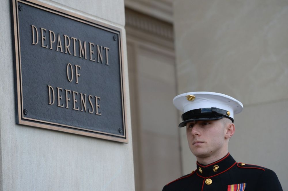 2014年1月13日,美军仪仗队士兵在五角大楼外参加仪式。(新华社记者殷博古摄)