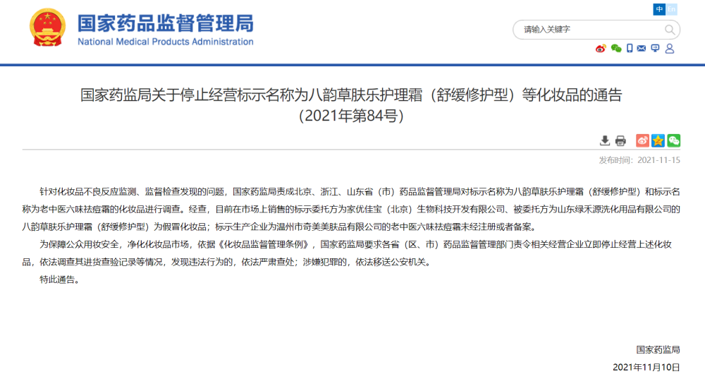 国家药监局关于停止经营标示名称为八韵草肤乐护理霜(舒缓修护型)等化妆品的通告