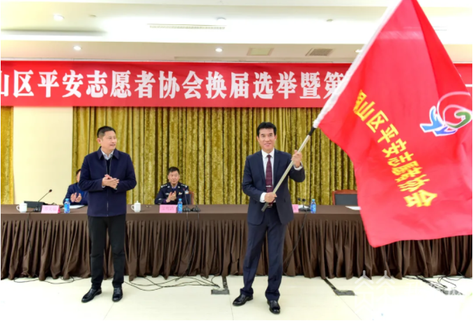 新当选的平安志愿者协会会长发言,并指出,当前,全区上下正紧紧围绕区域治理体系和治理能力现代化走在前列的目标,积极打造共建共治共享的社会治理新格局,全力建设水准更高、品质更优、群众认可的平安铜山。今后我和协会各位负责人将坚定不移围绕区委区政府的中心工作,按照政法委的统一工作部署,不辱使命、不负众托、尽职尽责、勇于承载新使命新担当,为切实维护社会大局和谐稳定,形成“平安环境大家创造、平安建设各方参与、平安成果人人共享”的良好局面做出应有的贡献。