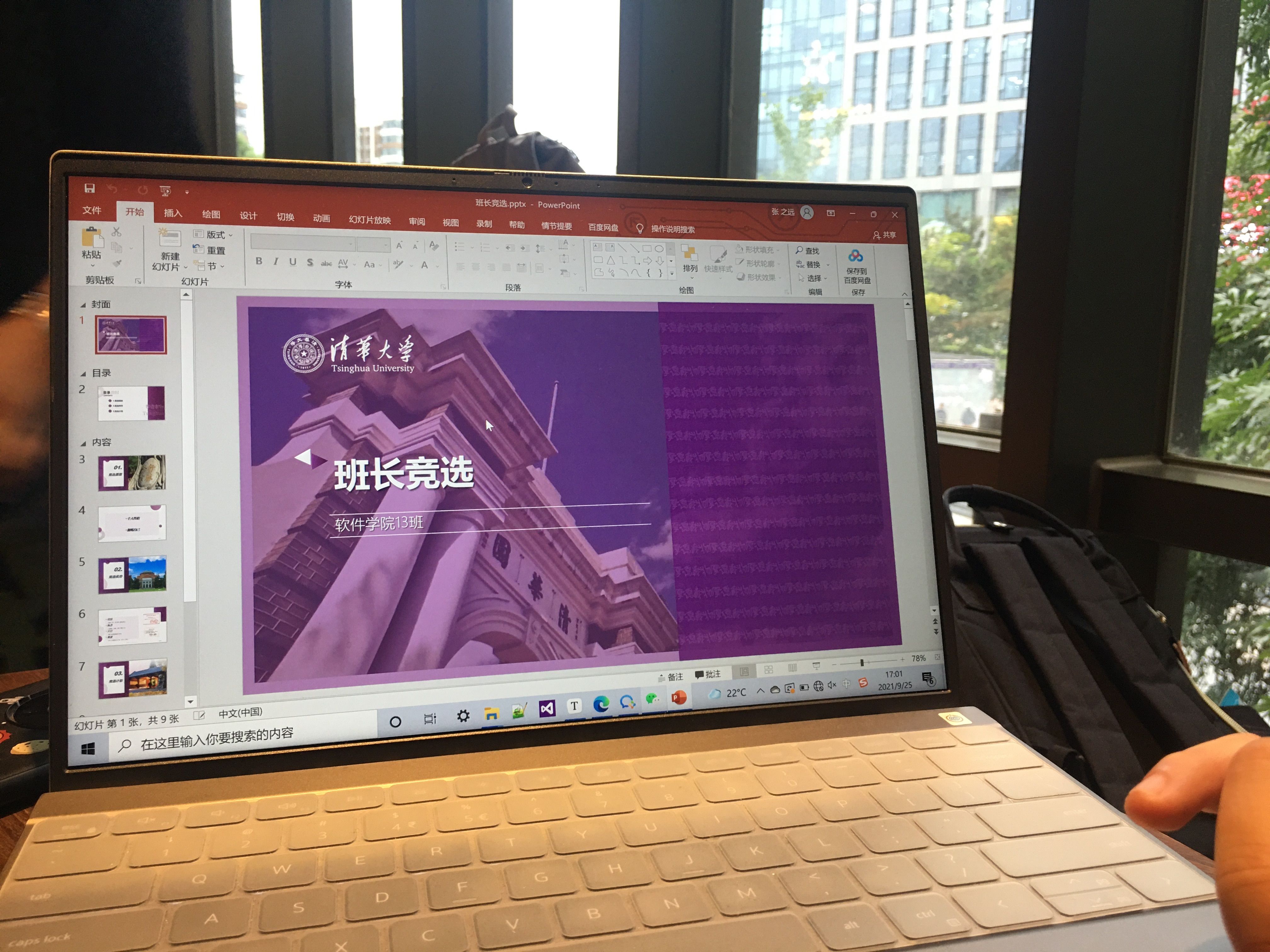 有多自来熟呢?就这么说吧,来清华不到半个月,他就把班上30个人的名字都记住了,“基本都能对上号”,接着顺理成章地当选为班长,对此他一边谦虚称是因为“大家都去选体委了!”,一边给我们展示了他为竞选班长精心制作的9页PPT。
