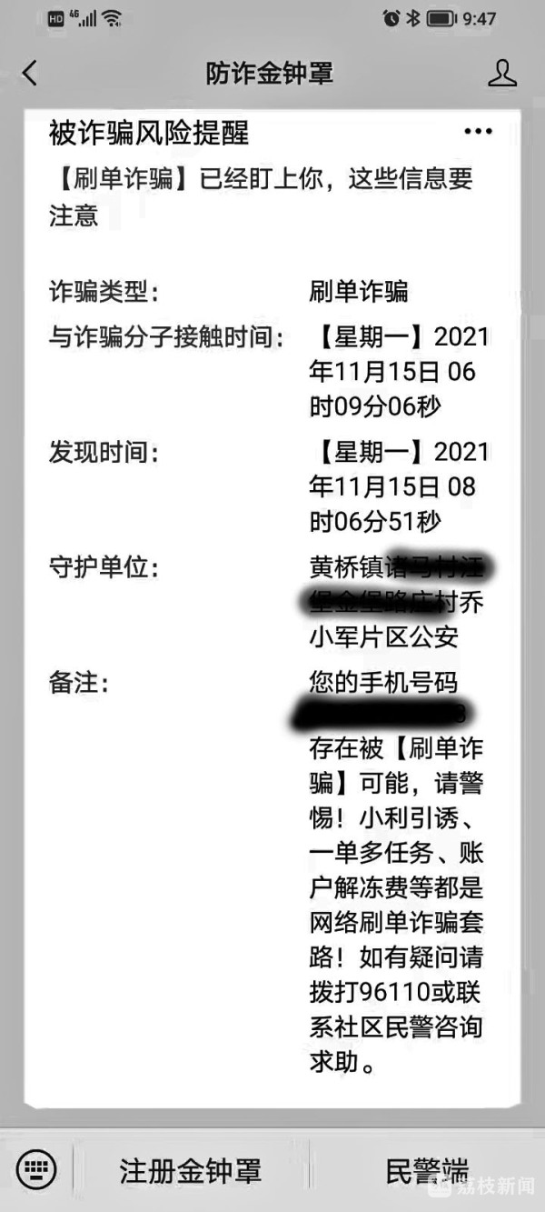 11月15日早晨8时06分,黄桥公安分局报警电话“铃!铃!铃!”响了起来,民警乔小军一看是“金钟罩”反诈骗系统向黄桥公安分局自动推送了高危诈骗预警信息。根据预警提示信息,乔小军民警根据预警信息提供的联系方式,及时与预警对象闻先生取得联系,提醒他接到的刷单赚钱的短信和电话是诈骗信息,不要轻信,防止财产损失。