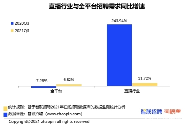 回到当下,井喷期虽然过去,但行业仍保持增长态势。数据显示,2021年第三季度直播行业岗位需求同比增幅11.72%,且学历要求有所提升。可见直播行业对高端人才的需求加大,正处于行业整体升级的关键时期,同时求职者面临的行业竞争日趋激烈,门槛逐步提升。